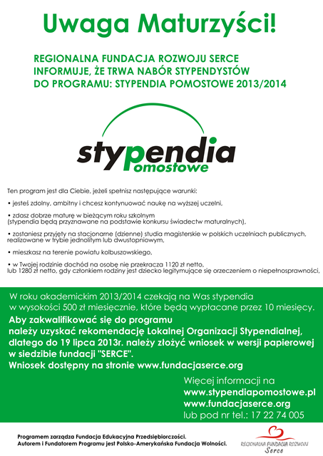 Fundacja Edukacyjna Przedsiębiorczości wraz z Polsko-Amerykańską Fundacją Wolności oraz Narodowym Bankiem Polskim, Fundacją PZU, Fundacją BRE Banku, Fundacją BGK im. Jana Kantego Steczkowskiego, Fundacją Wspomagania Wsi przy współpracy Agencji Nieruchomości Rolnych, oraz koalicją lokalnych organizacji pozarządowych ogłasza XII EDYCJĘ PROGRAMU STYPENDIÓW POMOSTOWYCH